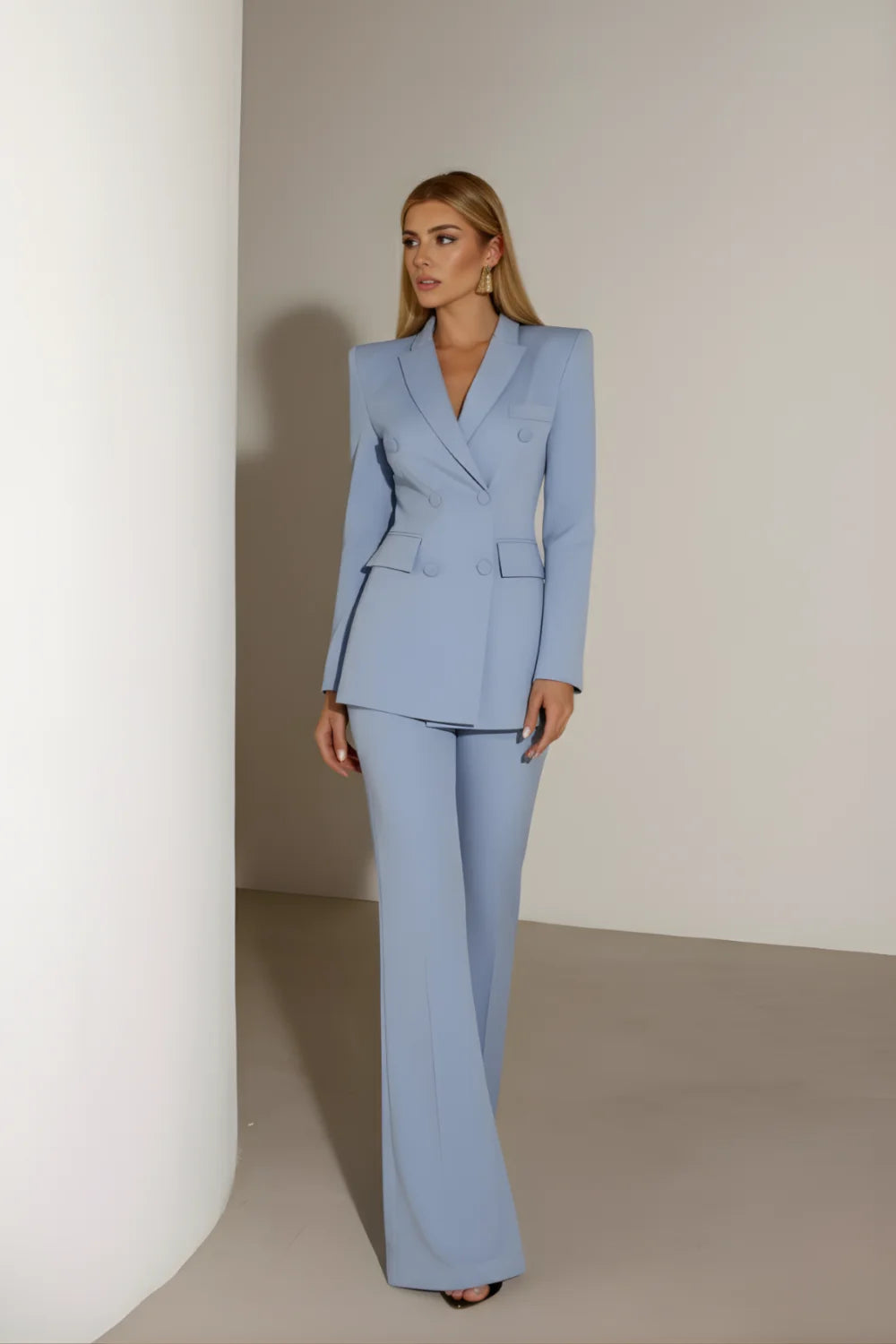 The Eudine Set in Purple exudes elegance and sophistication. The Jorja Ensemble is designed for those seeking a strong presence and refined style. The structured blouse with puffed sleeves, paired with the impeccably fitting wide-leg pants, offers a modern touch to femininity. Complete the look with the geometric gold buckle belt for a polished finish.