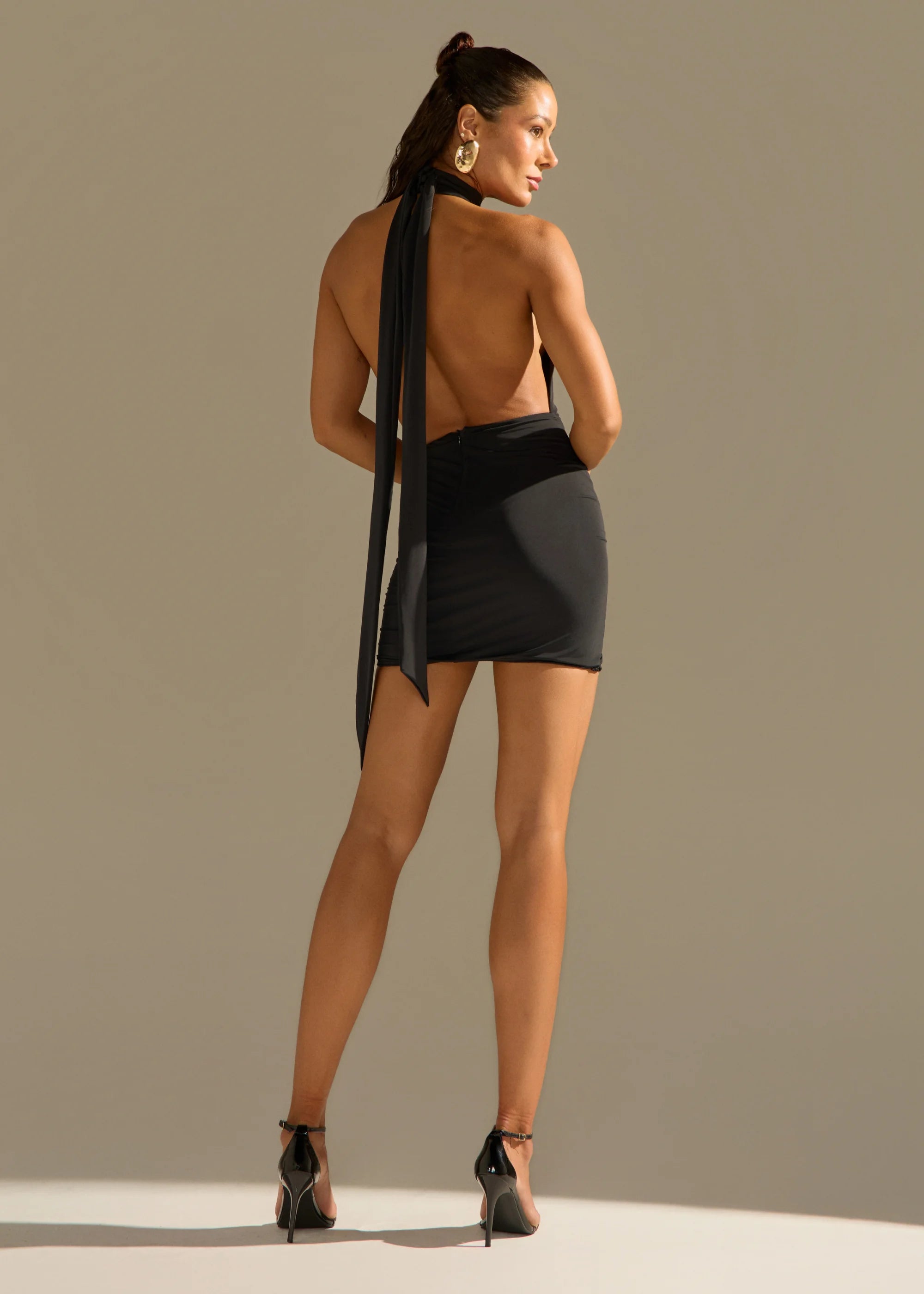 The Bruna Dress is expertly crafted with premium polyamide for a perfect fit and comfort. Its form-fitting silhouette, short length, and V-neck highlight femininity, while the halter neckline and elegant details add a touch of sophistication. Experience the perfect balance of sensuality and elegance with the Bruna Dress.