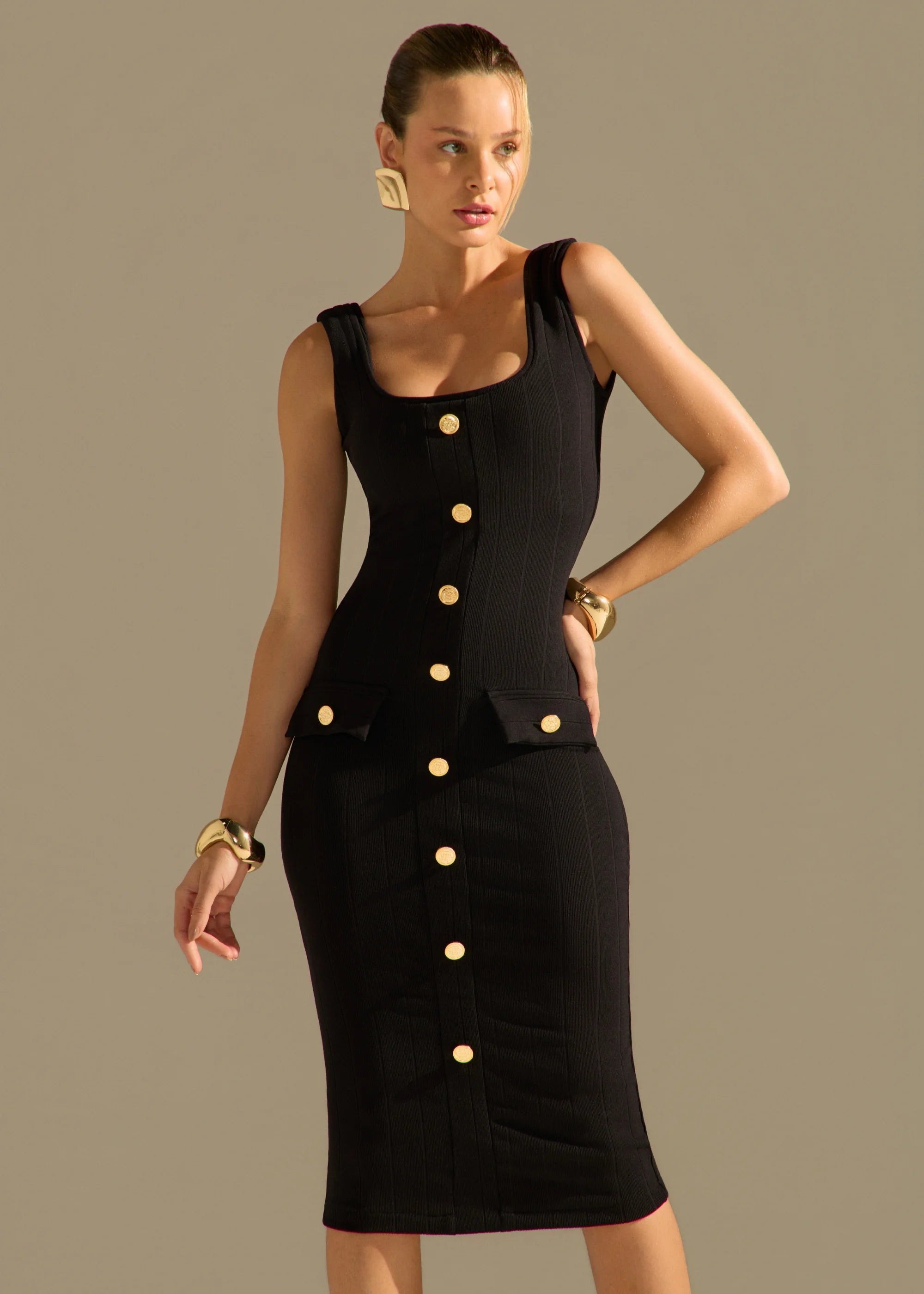 The Kim Dress is designed for a flattering fit with its thick straps and square neckline. The gold buttons add a touch of sophistication, while the premium knit fabric offers comfort and a flawless silhouette. The midi length makes it a versatile and elegant choice for any occasion.
