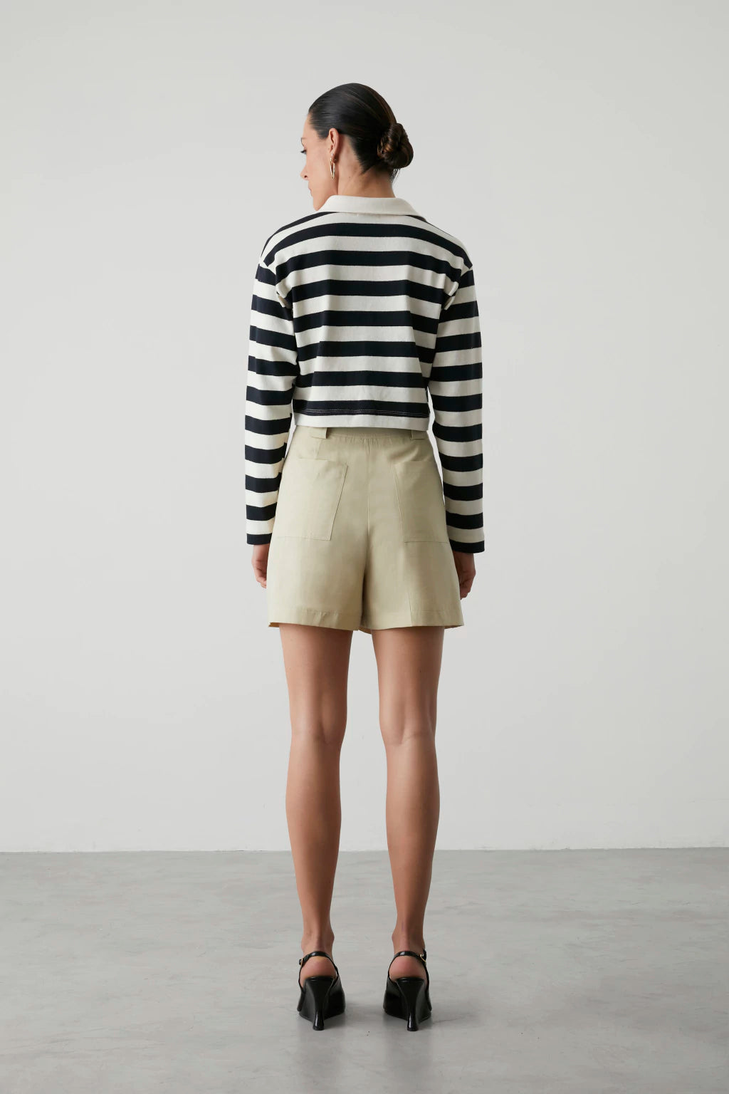 Discover the elegance of the Mel Black Shirt, an essential piece for those seeking sophistication and comfort. Made of 100% cotton, it features a polo style, long sleeves, and button closure at the collar. The charm lies in the striped detail and plain fabric collar, elevating the look in a subtle and refined way.