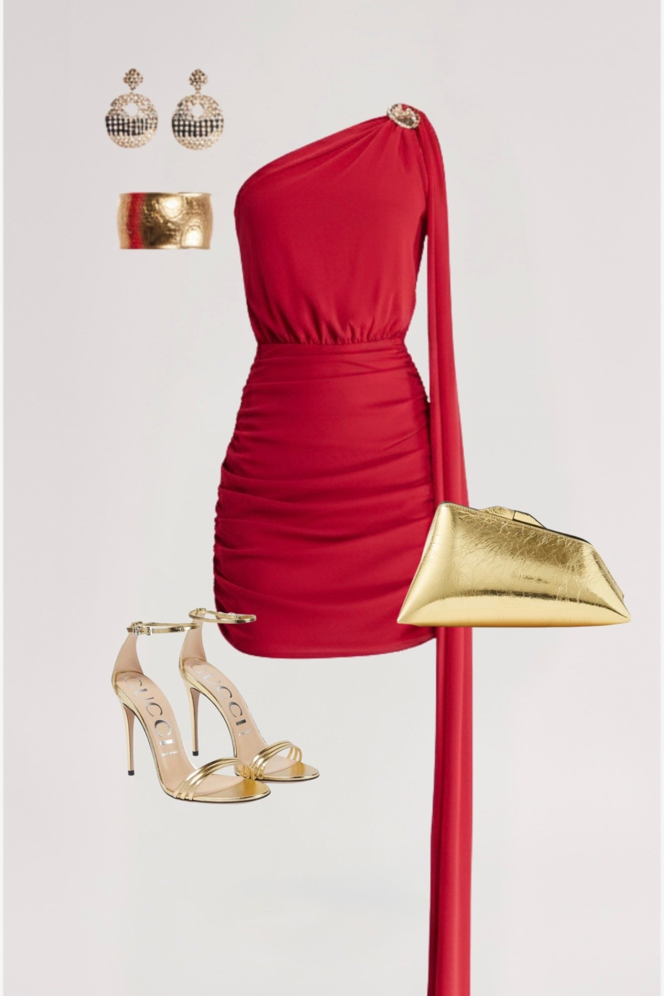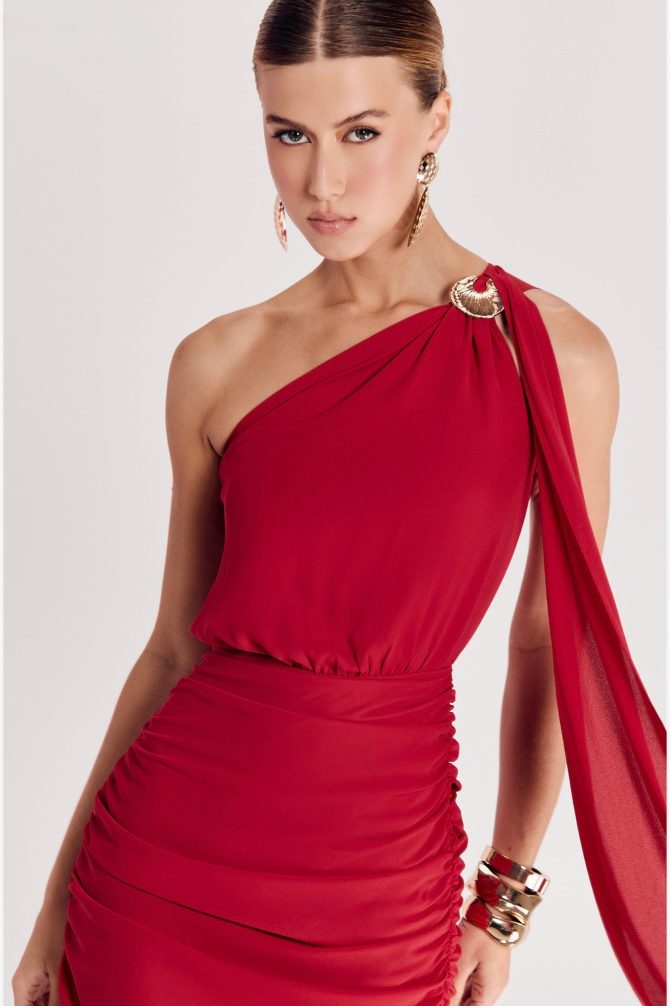 This Mini Dress features a single long draped sleeve with a stunning and elegant golden hardware detail, along with a unique scarf shoulder design. Perfect for special occasions, this dress combines style and sophistication for a chic and refined look.