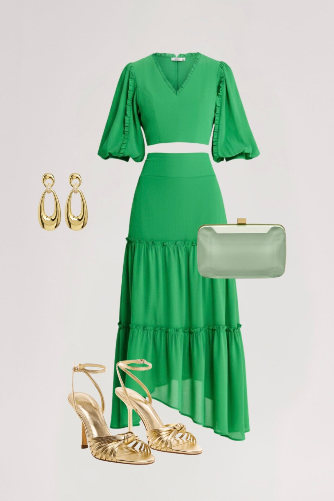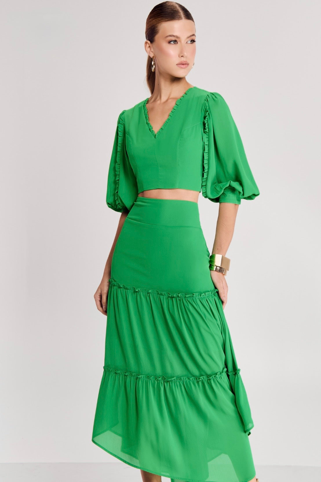 Discover the elegance of this set with a flowing skirt and delicate ruffled details. Elevate your style and feel confident in this sophisticated ensemble.